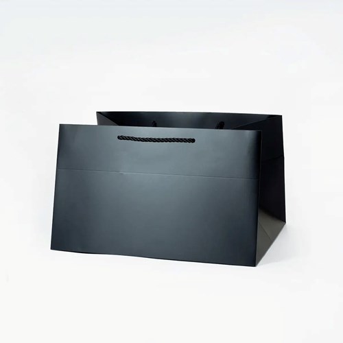 Matowa czerń nadaje torbie wyrazisty i elegancki charakter. Gładka powierzchnia o wykończeniu anti-scratch zachowuje estetykę nawet przy intensywnym użytkowaniu. Skręcane czarne uchwyty tworzą spójną, minimalistyczną całość i podkreślają premiumowy wygląd opakowania. Proporcjonalna forma prezentuje się stabilnie i profesjonalnie.