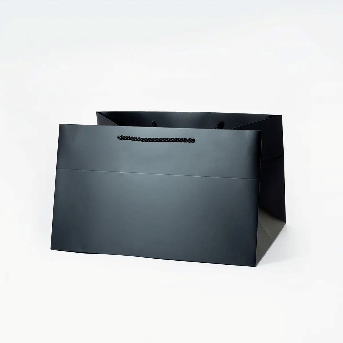Matowa, czarna powierzchnia skutecznie eksponuje zawartość i wzmacnia wizualny odbiór produktu. Solidna konstrukcja i wzmocnione dno zapobiegają deformacjom torby. Uchwyty są wygodne w noszeniu i dopasowane kolorystycznie do całości. To opakowanie, które wspiera spójny, elegancki wizerunek marki.