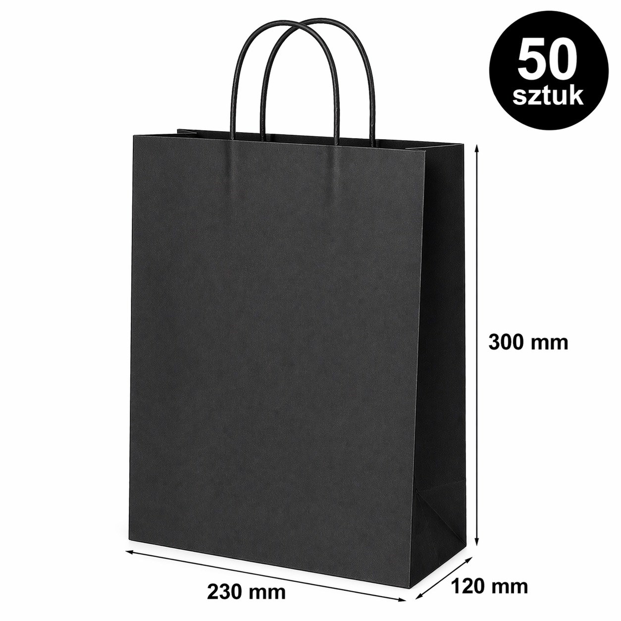 Zestaw 50 sztuk toreb papierowych ozdobnych w kolorze ciemnoszarym o wymiarach 230 × 120 × 300 mm przeznaczonych do pakowania prezentów oraz produktów.