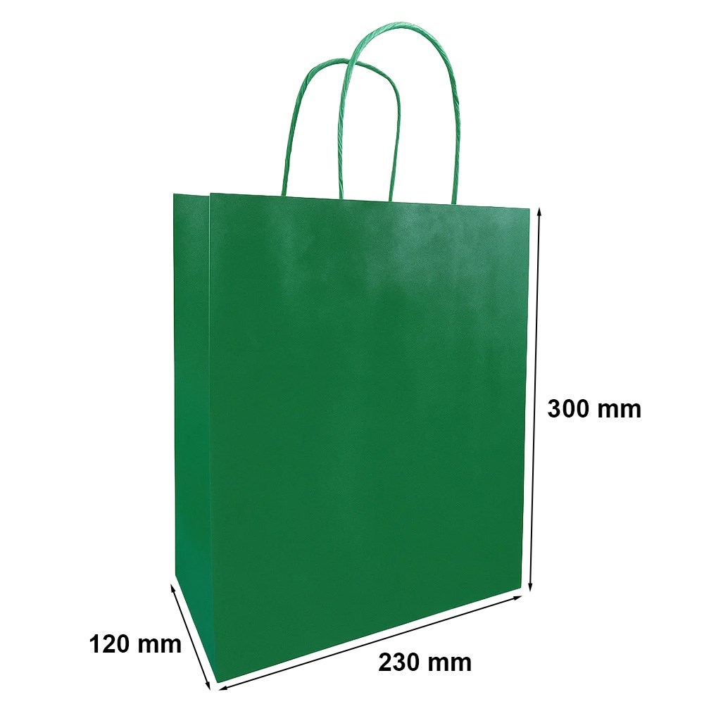 Zestaw 10 sztuk toreb papierowych ozdobnych w kolorze ciemnozielonym o wymiarach 230 × 120 × 300 mm przeznaczonych do pakowania prezentów oraz produktów.