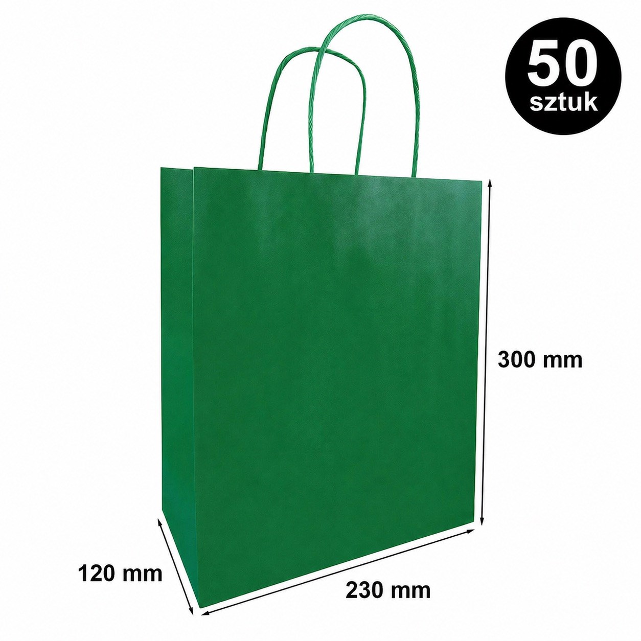 Zestaw 50 sztuk toreb papierowych ozdobnych w kolorze ciemnozielonym o wymiarach 230 × 120 × 300 mm przeznaczonych do pakowania prezentów oraz produktów.