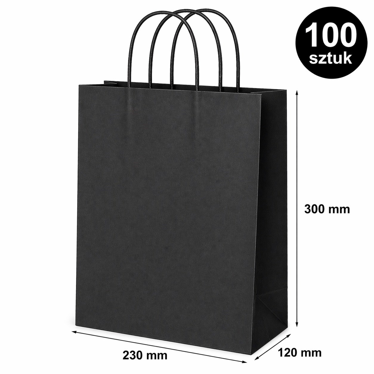 Zestaw 100 sztuk toreb papierowych ozdobnych w kolorze ciemnoszarym o wymiarach 230 × 120 × 300 mm przeznaczonych do pakowania prezentów oraz produktów.