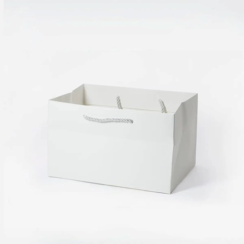 Matowa biel nadaje torbie czysty i minimalistyczny wygląd. Prosta bryła prezentuje się schludnie i estetycznie, podkreślając charakter zapakowanych produktów. Gładka powierzchnia dobrze utrzymuje wygląd nawet przy częstym użytkowaniu. Srebrne sznurkowe uchwyty stanowią subtelny, elegancki detal.