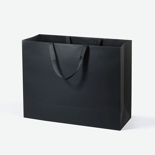 Matowa czerń papieru art paper nadaje torbie luksusowy i nowoczesny wygląd. Duża, masywna forma podkreśla pojemność opakowania i jego solidny charakter. Gładka powierzchnia oraz starannie wykończone krawędzie tworzą spójną, elegancką całość. Torba prezentuje się efektownie nawet przy bardzo dużych produktach.