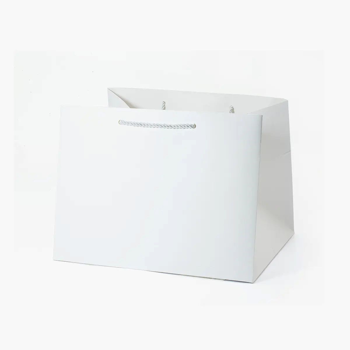 Czysta biel i matowe wykończenie nadają torbie nowoczesny i elegancki wygląd. Prosta, wysoka forma podkreśla pojemność opakowania i pozwala estetycznie eksponować zawartość. Srebrne sznurkowe uchwyty stanowią subtelny detal wizualny i dobrze komponują się z jasną powierzchnią. Całość prezentuje się profesjonalnie i spójnie.
