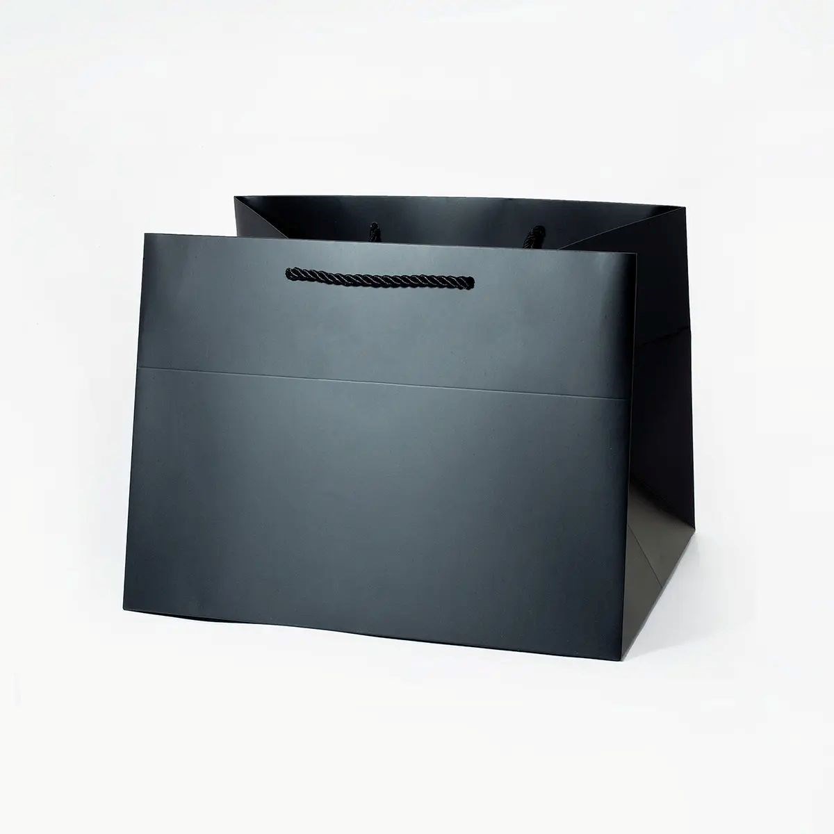 Czarna, matowa powierzchnia wzmacnia odbiór wizualny produktów premium. Sztywna konstrukcja pomaga utrzymać estetyczny kształt torby przy większym obciążeniu. Wykończenie anti-scratch ogranicza widoczność śladów użytkowania. To opakowanie, które wspiera elegancki i profesjonalny wizerunek marki.