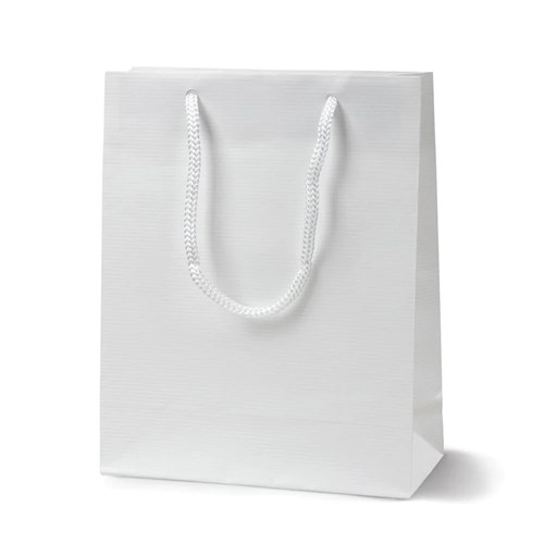 Laminowana torba papierowa Prestige w kolorze białym to praktyczne opakowanie przeznaczone do pakowania produktów oraz materiałów promocyjnych. Wymiary 170×70×210 mm odpowiadają formatowi A5, dzięki czemu torba dobrze sprawdza się przy pakowaniu mniejszych przedmiotów.