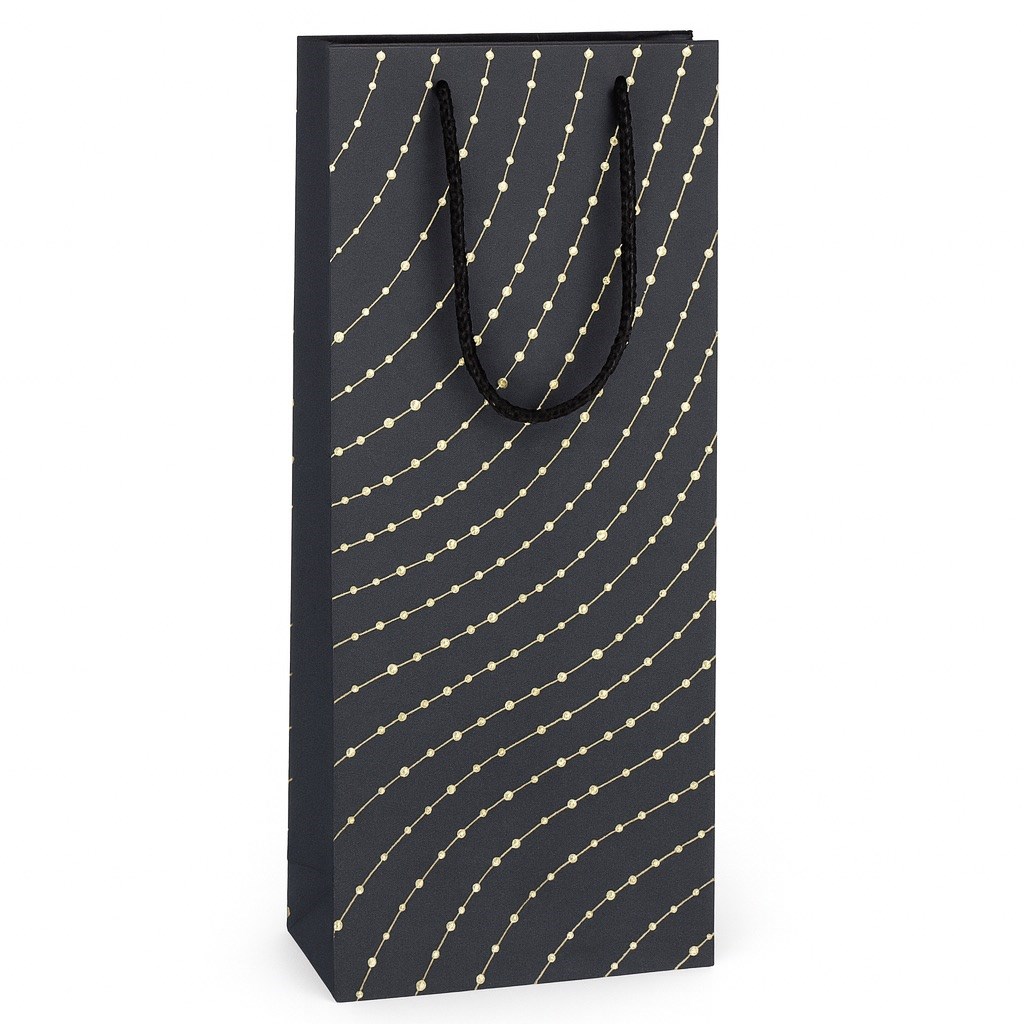 Elegancka torebka prezentowa na wino w czarnym kolorze z złotymi zdobieniami to ponadczasowe połączenie stylu i elegancji. Świetnie sprawdzi się jako efektowne opakowanie, które nadaje prezentom wyjątkowego charakteru.