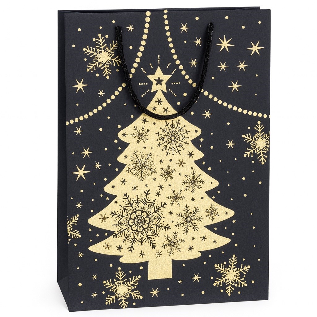Elegancka torebka prezentowa na wino w czarnym kolorze ozdobiona złotą choinką i śnieżynkami to doskonałe opakowanie, które podkreśla świąteczny klimat i nadaje prezentom wyjątkowego charakteru.