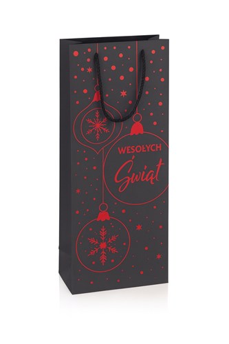 Czarna świąteczna torebka na wino zachwyca klasycznym wyglądem połączonym z intensywnie czerwonymi akcentami. Czerwone bombki tworzą efektowną, kontrastującą dekorację, która nadaje torbie świątecznego charakteru. Napis „Wesołych Świąt” w tej samej kolorystyce dodatkowo podkreśla estetyczny i przyjazny klimat upominku. Dzięki dwukomorowej konstrukcji to opakowanie idealnie sprawdzi się przy tworzeniu eleganckich zestawów prezentowych.