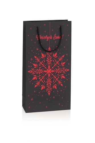 Czarna świąteczna torebka na wino prezentuje się elegancko i nowocześnie dzięki zestawieniu ciemnej kolorystyki z intensywnie czerwonym akcentem. Czerwony napis „Wesołych Świąt” wyróżnia się na tle torby i nadaje jej wyrazistego, świątecznego charakteru. Centralnie umieszczona czerwona śnieżka pełni rolę ozdobnego elementu, który podkreśla dekoracyjny styl opakowania. Dwukomorowa budowa sprawia, że to doskonały wybór na estetyczne pakowanie dwóch butelek.